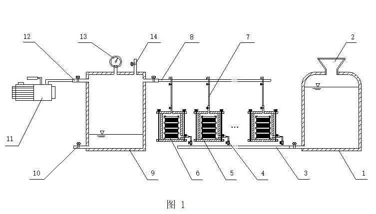 1-储水缸,2-开口,3-进水总管(塑料软管),4-流量微调阀,5-饱和缸,6-岩土样品,7-出水支管,8-出水总管,9-溢流缸,10-溢流缸排水口,11-真空泵,12-出气口,13-负压表,14-进气口