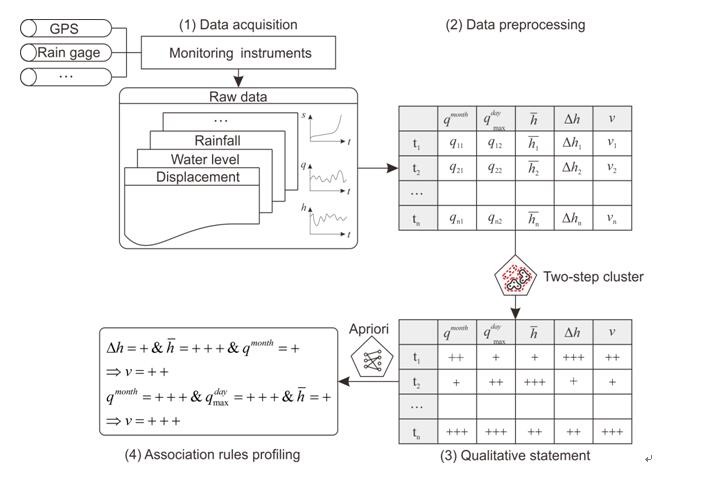 Junwei Ma,Huiming Tang, Xinli Hu, Antonio Bobet, Ming Zhang, Tingwei Zhu, Youjian Song, Mutasim A. M. Ez Eldina. Identification of Causal Factors for the Majiagou Landslide using Modern Data Mining Methods[J]. Landslides, 2016: 1-12. doi:10.1007/s10346-016-0693-7 Abstract:In this study, a data mining approach is proposed to investigate the hydrological causes of the Majiagou landslide, located in the Three Gorges Reservoir in China. It is possible to determine the cause-and-effect relationships between hydrological parameters and landslide movement. The data mining approach consists of two steps: first, hydrological indicators and landslide movements are discretized using the two-step cluster analysis; second, the association rule mining with the Apriori algorithm is employed to identify the contribution of each hydrological parameter to landslide movement. The results obtained suggest that deformation and later failure occurred first at the toe of the landslide and progressed upslope due to rising water level in the reservoir, prolonged heavy rainfall, and rapid drawdown in the reservoir. The proposed novel use of field data and data mining has the potential for providing procedures and solutions for an effective interpretation of landslide monitoring data.