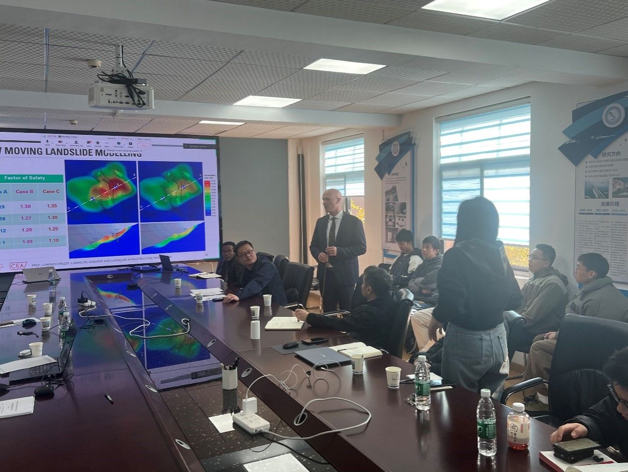 Lorenzo Brezzi教授做了题为 “Landslide Hazards and Landslide-infrastructure Interaction: Advanced Monitoring Modelling, and Innovative Stabilization Solutions” 的学术讲座。Lorenzo Brezzi教授的讲座围绕滑坡灾害与基础设施的相互作用展开,特别强调滑坡现象的复杂性以及监测与干预的挑战。他总结道滑坡灾害不仅仅是自然现象,更是与基础设施密切相关的复杂系统,如何在预警、监测和干预中有效应对这些挑战是当前研究的关键。其指出,“滑坡是一种复杂的现象;检测是具有挑战性的,了解它们的特征以及与基础设施的相互作用甚至更难。” 他认为研究必须提前应对日益强烈的滑坡事件,重点是识别高风险区域、建模灾害影响并制定减灾策略。现代监测技术和建模方法,尤其是光纤技术,能够提供持续监测和更精确的灾害预测,进而为滑坡防治提供可行的解决方案。