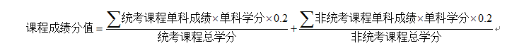 鉴于研究生学业课程设置的特殊性,同时也为了尽量体现所修课程的难易程度,将课程分为统考课程(非安全专业为VC++、弹塑性力学、数值分析及数理方程等四门课程; 安全专业为VC++、数理统计、多元统计分析、随机过程等四门课程)和非统考课程(除统考课程以外的课程)并在计算中各赋予权重系数0.2(权重说明:研究生应修学分规定为25个,其中统考课程为9个,其原始比重为9/25=0.36;非统考成绩为16个学分,其原始比重为16/25=0.64。统一调整权重为0.2)。根据调整后的权重,研究生课程成绩按下式进行计算分值: