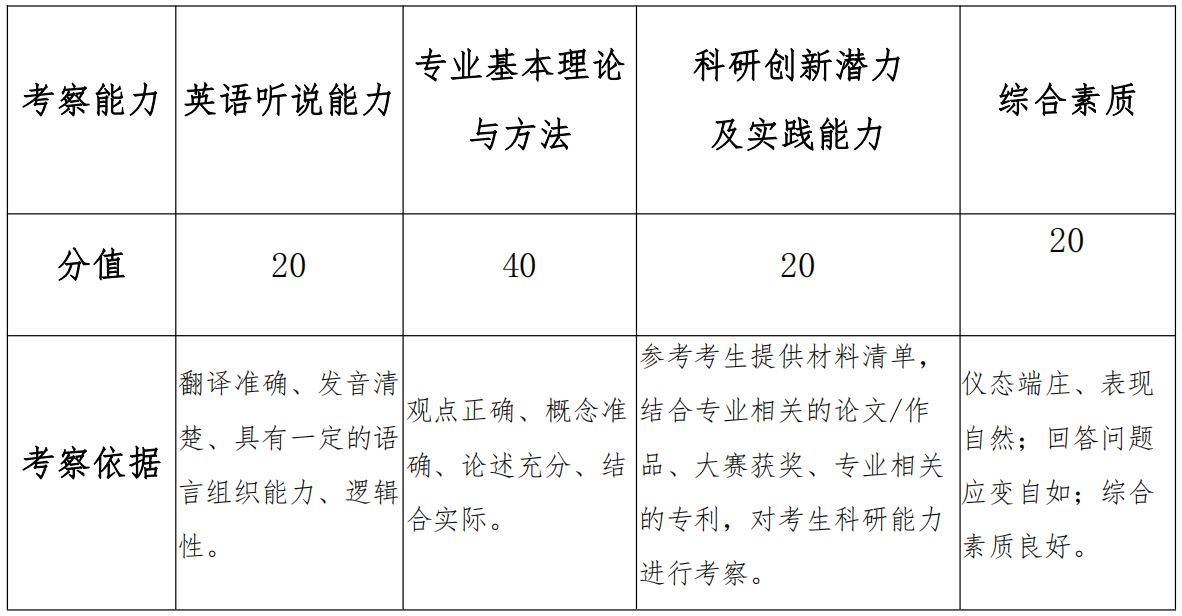 2.综合面试。重点考察考生的思想政治素质和品德考核、专业综合能力、创新潜质和能力、外语能力水平、综合素质评价、心理健康状况等。综合面试一般包括考生自述、考生随机抽题、面试小组提问交流、专家评分等环节,考核时长一般不少于20分钟。