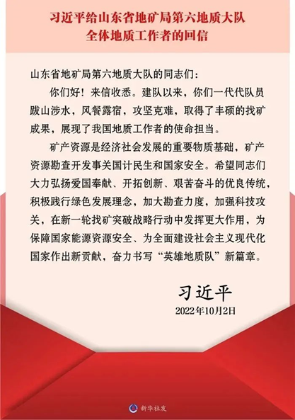 中共中央总书记、国家主席、中央军委主席习近平10月2日给山东省地矿局第六地质大队全体地质工作者回信,对他们弘扬优良传统、做好矿产勘查工作提出殷切期望。