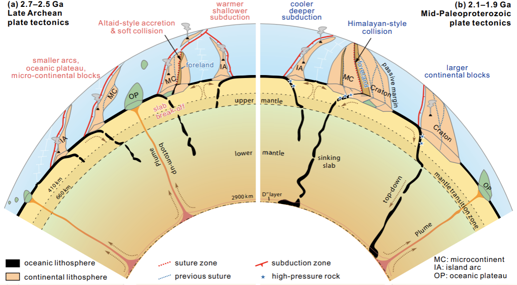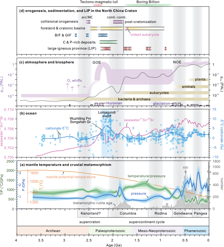此外,研究团队通过整合构造、碎屑金红石/锆石和变质大数据等多方面证据,约束了新太古代和古元古代明显不同的变形和变质作用样式,认为该样式差异可能是新太古代和古元古代造山作用和板块构造样式发生转变的响应,即太古宙以阿尔泰型弧陆增生-软碰撞、缺乏高压变质作用和形成超级克拉通等为特征,而古元古代广泛发育喜马拉雅型陆陆碰撞,出现冷俯冲、全球性超大陆聚合等为特征(图2)。研究团队进一步提出造山带隆升-剥蚀及硅酸盐风化过程可能对古元古代早期水圈、大气圈和生物圈产生了重要影响,而有机物埋藏、沉积物俯冲等过程又进一步促使古元古代造山作用样式的转变,体现了固体-表生圈层相互作用和协同演变的复杂地球系统演化观。