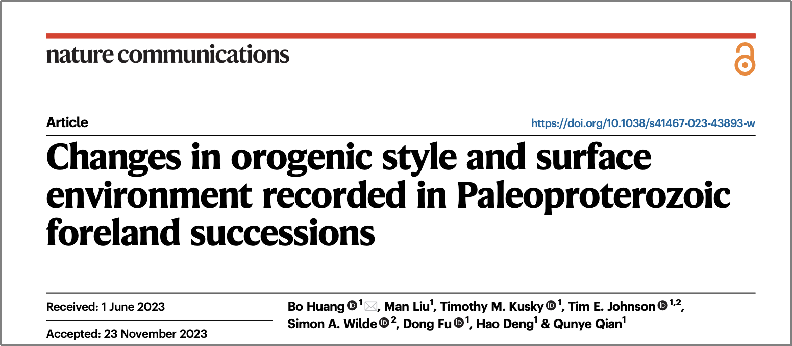 Huang, B. (黄波), Liu, M. (刘满), Kusky, T.M., Johnson, T.E., Wilde, S.A., Fu, D. (付冬), Deng, H. (邓浩), Qian, Q. (钱群叶), Changes in orogenic style and surface environment recorded in Paleoproterozoic foreland successions. Nature Communications 14, 7997 (2023). https://doi.org/10.1038/s41467-023-43893-w