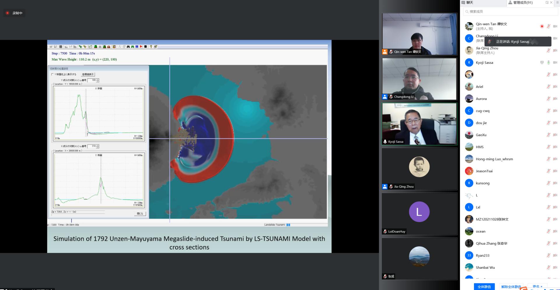 Sassa教授以The Fifth World Landslide Forum and the Launching of the New Open Access Book Series "Progress in Landslide Research and Technology" in November 2021为题,展示了国际滑坡协会在滑坡防灾减灾领域所做的系列工作,并着重介绍了最近成功举办的第五届国际滑坡论坛(The 5th World Landslide Forum)以及即将推出的专著"Progress in Landslide Research and Technology"。接下来,Sassa教授分享了课题组研发的高速环剪仪(ICL-2型)、滑坡和涌浪模拟软件(LS-Rapid),以及借由此研究、解决的滑坡案例等等。