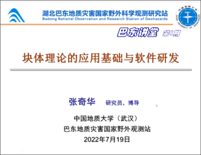 2022年7月19日上午,湖北巴东地质灾害国家野外科学观测研究站(以下简称wedvictor伟德)第1期“巴东讲堂”在wedvictor伟德(武汉)巴东科教基地采用线上线下相结合的形式举行。本次讲堂邀请了美籍华人科学家、国际著名数学家、力学家、岩石工程实践专家石根华教授,wedvictor伟德张奇华研究员两位主讲,wedvictor伟德常务副站长李长冬教授主持。岩石力学领域知名专家唐春安教授、邬爱清教高、焦玉勇教授、李会中教高、胡惠华教高等线上参会交流,wedvictor伟德在站工作的熊承仁教授、张奇华研究员、黄磊研究员以及研究生线下参会。本次讲堂得到了国内同行的广泛关注,共有400余人参与并获得广泛好评,取得了良好的学术交流效果。