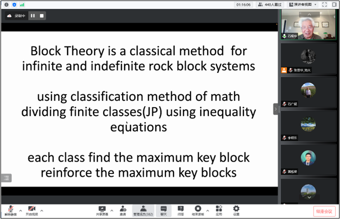 石根华教授主讲的题目是“块体理论的过去和未来”。石先生结合自身丰富的经历,讲述了他在白龙江电站建设中遇见的岩石开挖安全事故并创立全空间赤平投影法,最后发展形成岩石工程经典方法“关键块体理论”的历程;分享了采用块体理论解决工程问题的经验;并联系到非连续变形分析(DDA)、接触算法等,阐述了各种理论方法的相互关联及多个学科方向的相互促进;最后展望了包括块体理论在内的非连续分析方法在今后的发展趋势。