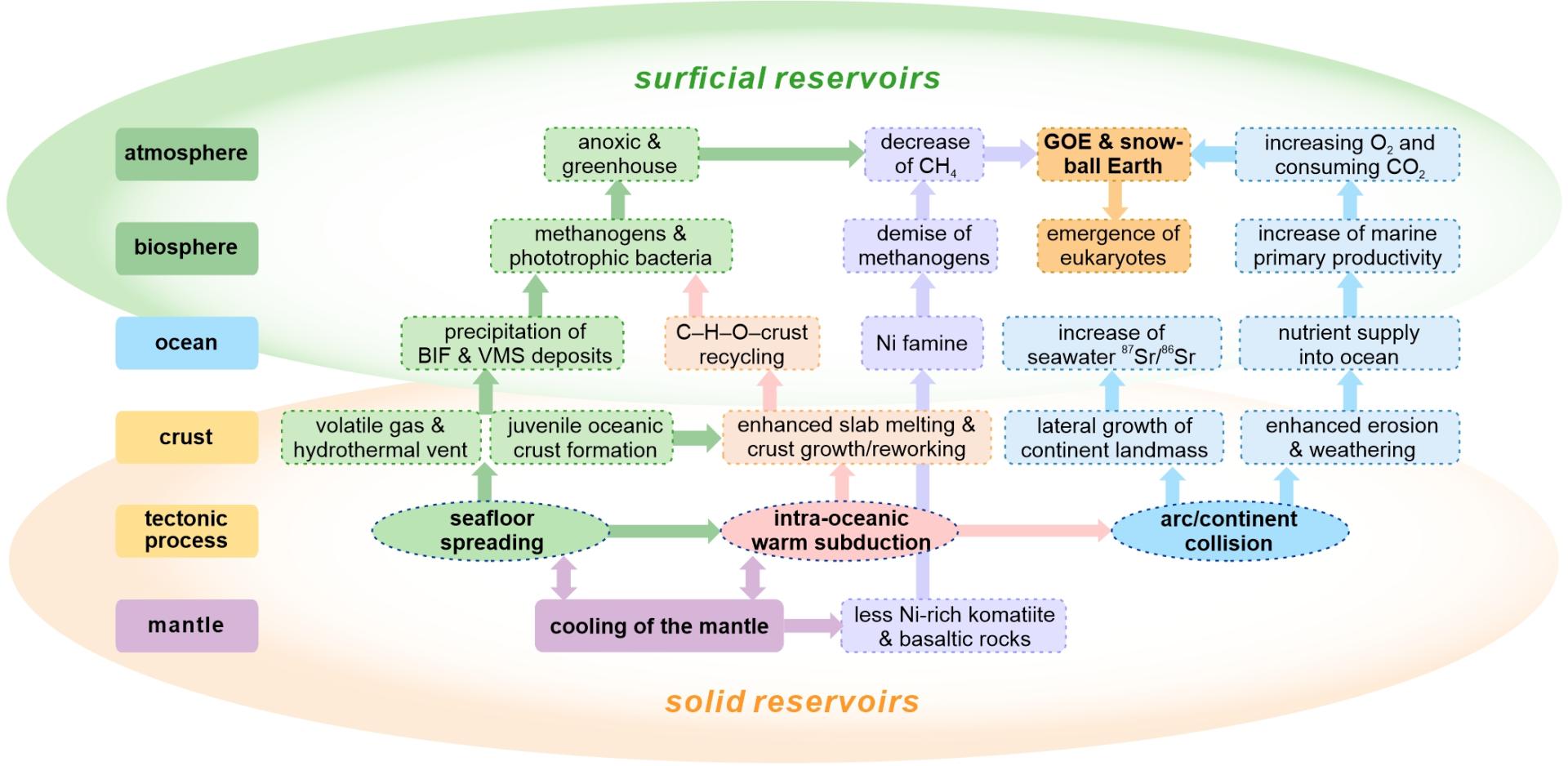 图4 太古宙-元古宙之交板块构造过程对地球固体圈层和表生圈层影响的概念模型