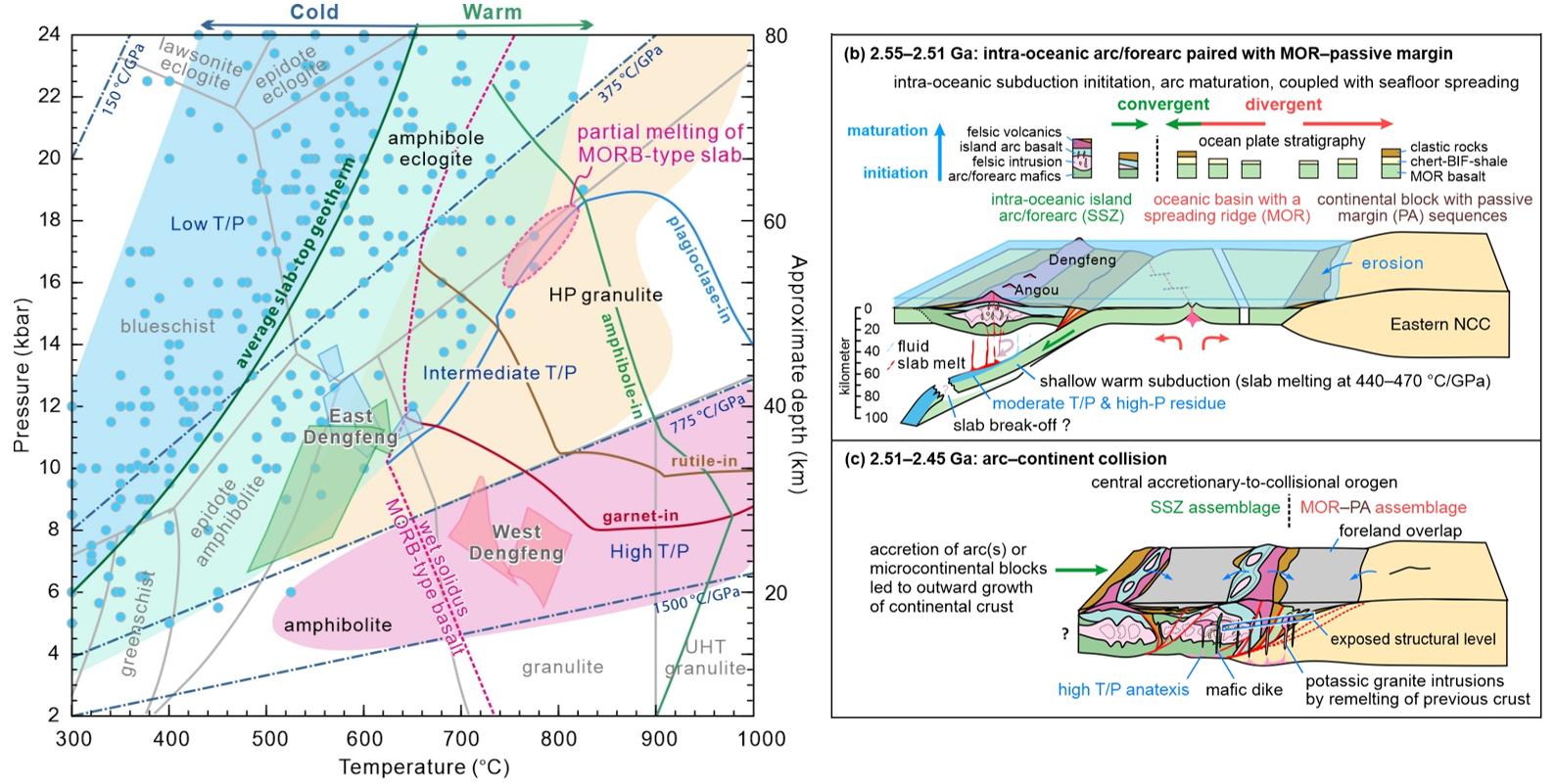 研究人员进一步根据地球化学特征和热力学-微量元素正演模拟提出该地区英云闪长岩-奥长花岗岩-花岗闪长岩组合(TTG)和埃达克质火山岩形成于俯冲板片部分熔融及随后的分离结晶;模拟计算显示该俯冲带拥有较高的地热梯度(~440–470 °C/GPa),其与显生宙暖(热)俯冲带一致(图3)。通过太古宙末期和显生宙俯冲带和造山带样式对比,认为太古宙末期的板块构造过程与显生宙已具有一定的相似性;而以冷-深俯冲碰撞和全球性内部相连板块边界为特征的“现代样式”板块构造体制可能直到古元古代中晚期(22-19亿年前)才完全建立。