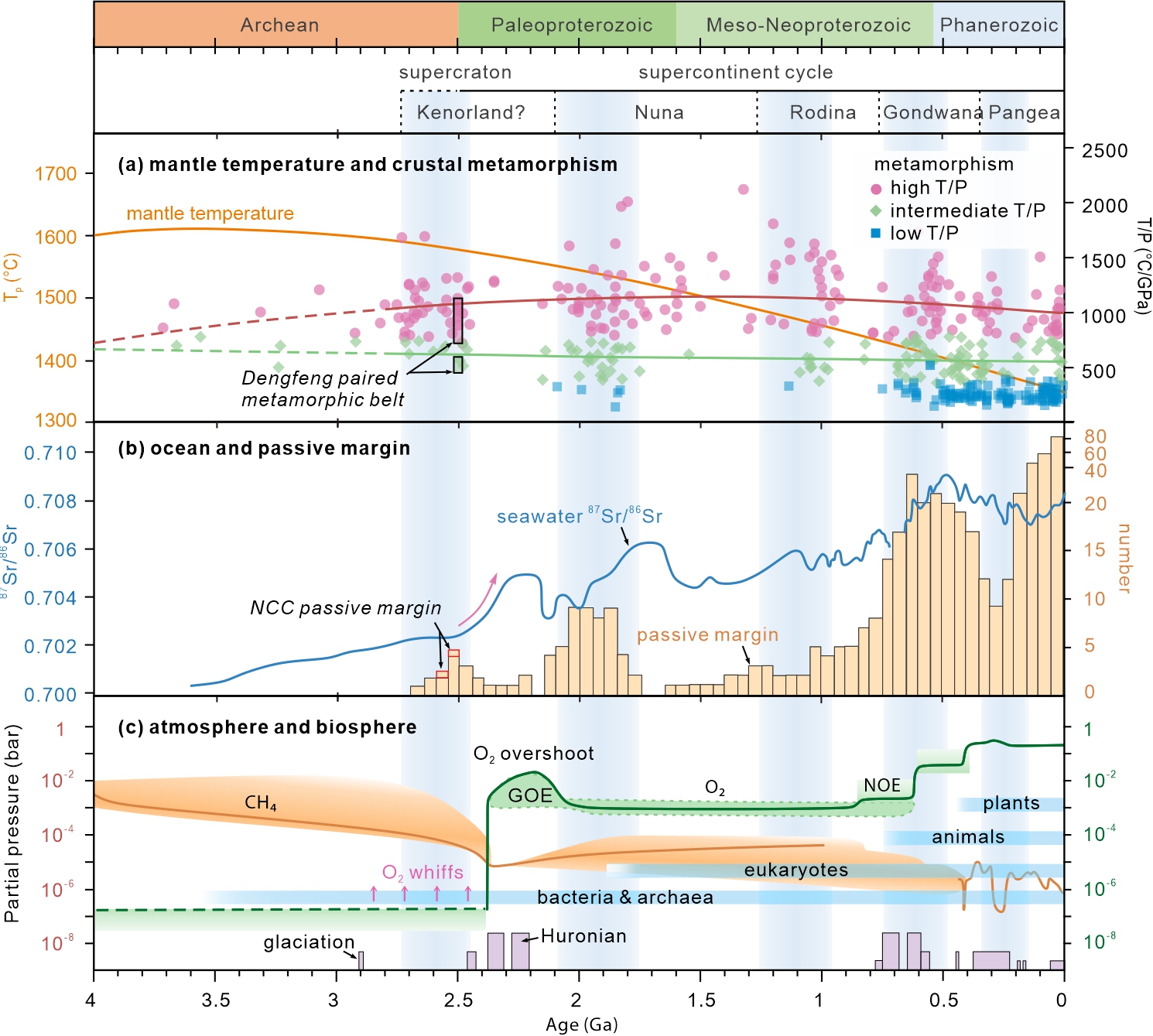 新太古代到古元古代(28–16亿年)是地球历史上最具变化性的时期之一(图2),见证了全球性的克拉通化、大量陆地浮出地表以及大气中氧气量增加(古元古代大氧化事件,GOE)。这段时间也被认为是全球范围内某种样式的板块构造形成的关键时期,导致了超大陆旋回的开始。然而,目前在太古宙岩石记录中很少发现能够指示板块侧向运动的时空相伴的离散和汇聚板块边界岩石组合和造山带分带,这加剧了太古宙是否存在板块构造的争论。此外,如果太古宙晚期存在板块构造,那么其样式(尤其是俯冲带热状态和规模)及其对地球表层环境的影响等关键科学问题也有待深入研究和探寻。