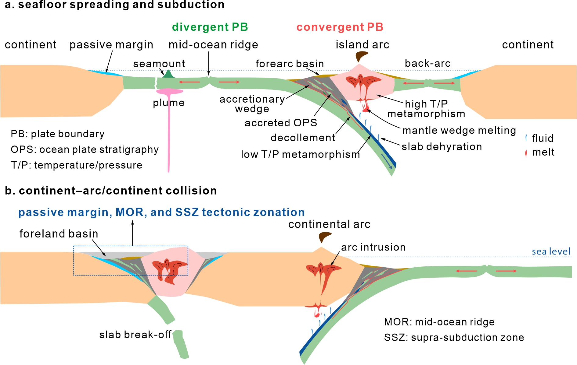 在地质历史时期,板块离散和汇聚过程可通过古老造山带的特征性岩石-构造组合记录下来,如被动大陆边缘沉积序列、洋中脊型洋壳残片、俯冲带上盘型岩浆岩、增生杂岩、低T/P-T/P变质岩(双变质带)和弧前/前陆盆地沉积等,它们通常时空相伴保存于造山带,并形成显著的岩石构造分带(图1)。识别可以指示不同板块边界端元的岩石构造组合,并详细刻画这些板块边界在地球历史中可能发生的变化,是探索了解地球动力学演化和板块构造发展的重要研究途径之一。