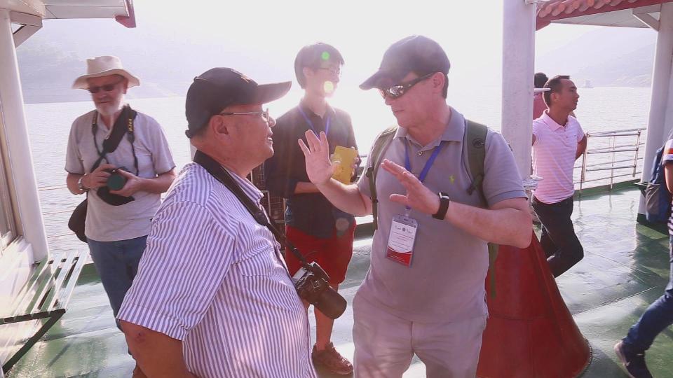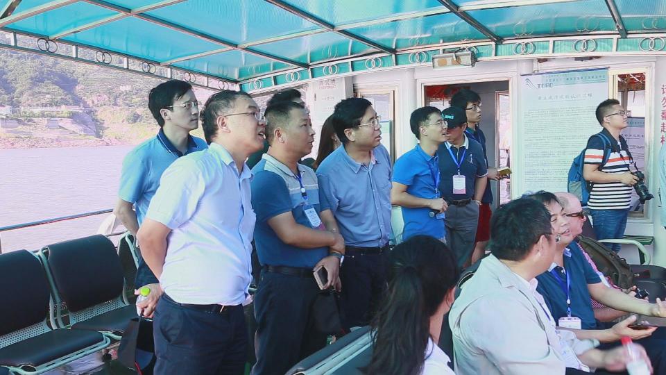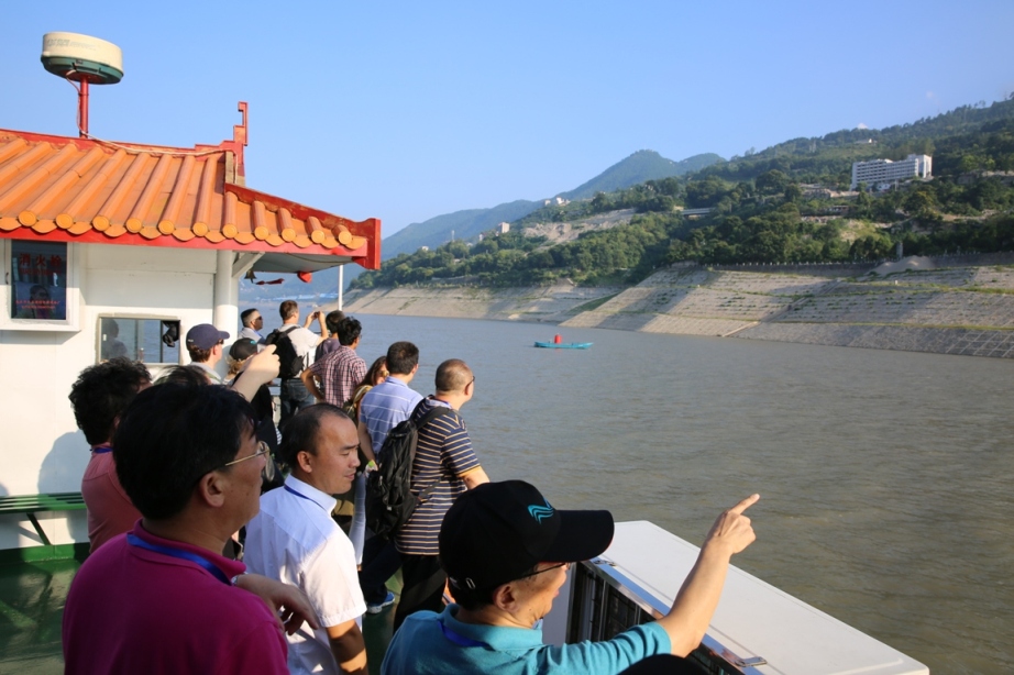 船只行驶至黄土坡滑坡前缘位置,与会专家们总体考察了黄土坡滑坡的全貌,并结合图文资料和讲解员介绍,分别从黄土坡滑坡体地质条件、滑坡体结构组成、滑坡变形特征、滑坡形成机制、滑坡体渗流场等多角度详细了解黄土坡滑坡,并就滑坡的成因、支护形式及可能的位移变形趋势进行了热烈的讨论和交流。