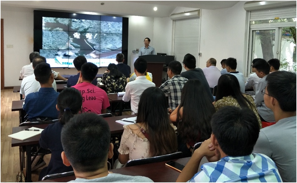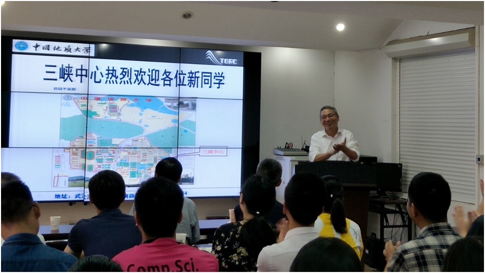 三峡中心副主任苏爱军讲话。他首先代表三峡中心对2017级研究生新生表示热烈欢迎。随后苏主任从机构设置、师资力量、实验设备、科研项目和国际交流等几个方面对三峡中心进行了全面详细的介绍,并展示了三峡中心巴东野外试验场、秭归野外教学实验基地等研究基地的建设及应用情况。