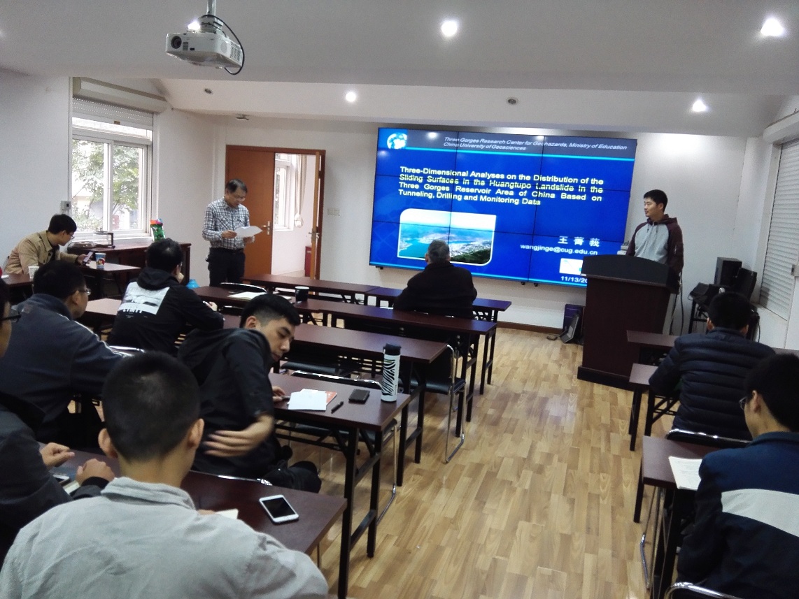 10月24日,邹宗兴博士作了题为《水库运行条件下三峡库区树坪滑坡演化机理研究》的首场报告,提出典型库岸滑坡地质力学模型,在大量监测数据基础上,分析典型库岸滑坡演化趋势,为三峡水库正常运行下,库岸滑坡长期稳定性评价与综合治理提供基础和理论支撑。随后,邹老师还分享了他在美国学习的见闻和收获,为即将出国留学的师生提供了参考。