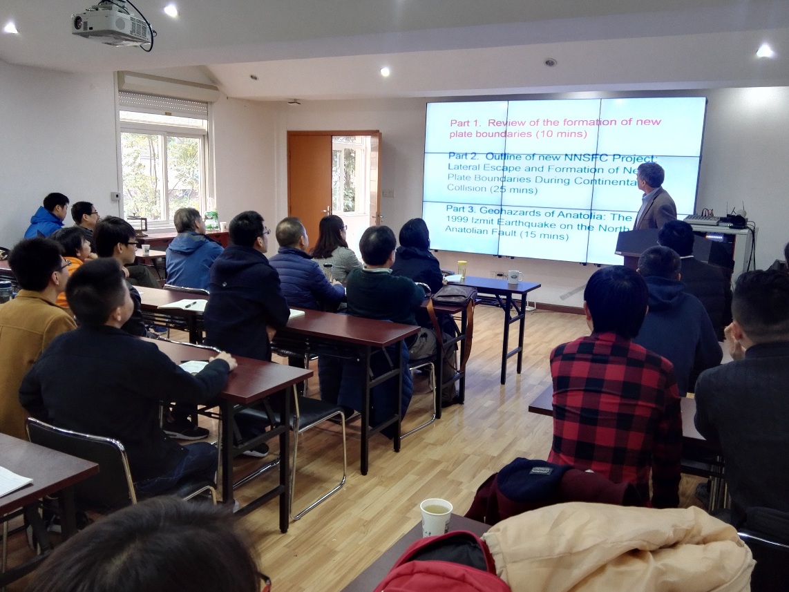 11月22日,Timothy Kusky教授在中心作题为《Active Tectonics and Geohazards of Anatolia:Tectonic Escape in the Arabia/Eurasia Collision Belt》的学术报告,Timothy Kusky教授主要为我们介绍了现今有关侧向挤出、海沟回撤和抽吸、下地壳加厚和深地壳流、板底拖曳四种驱动力的大地构造、构造地质、地球物理及数值模拟工作,以及对应的新构造和地质灾害。在场同学们纷纷表示听完讲座后,十分受益。