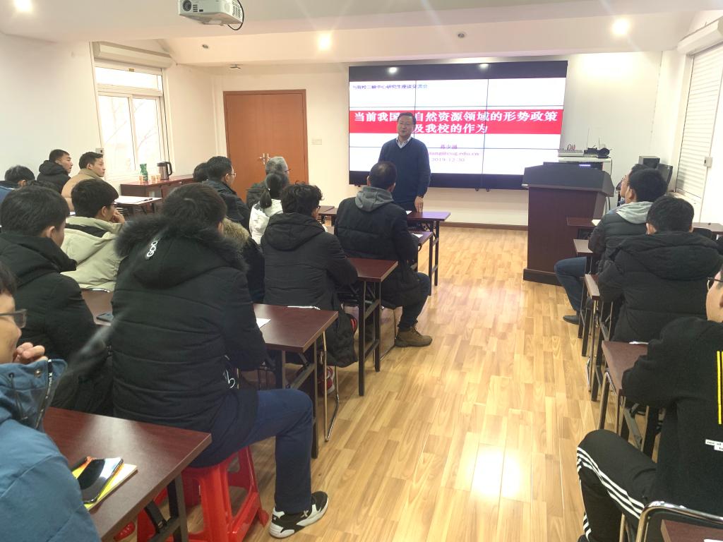 座谈会上,蒋少涌教授详细了解中心课程安排、师资配备、工作环境、网上选课等内容,耐心解答同学们学习中的疑问,希望大家能在自然资源领域学有所成、有所作为。